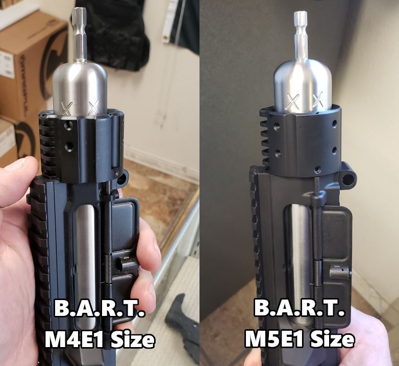 Now Available, B.A.R.T. 1.0 in M4E1 and M5E1 sizes to fit the new enhanced AR uppers.  They will not properly lap the standard uppers so please use the standard-sized B.A.R.T. tools for that purpose.